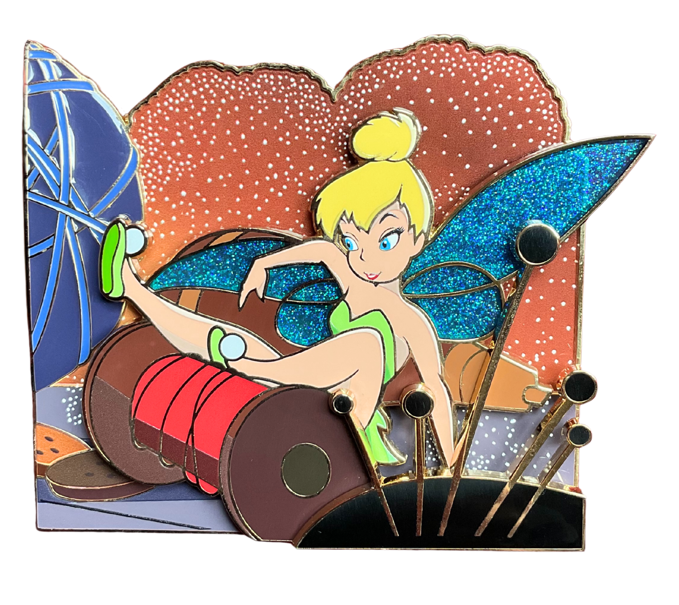 Clumsy Tinkerbell Our newest Jumbo 100 pin featuring a three layer pin design! This pin depicts Tinkerbell, with her intensely glittering see through wings, fallen amongst the sewing supplies as...