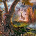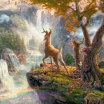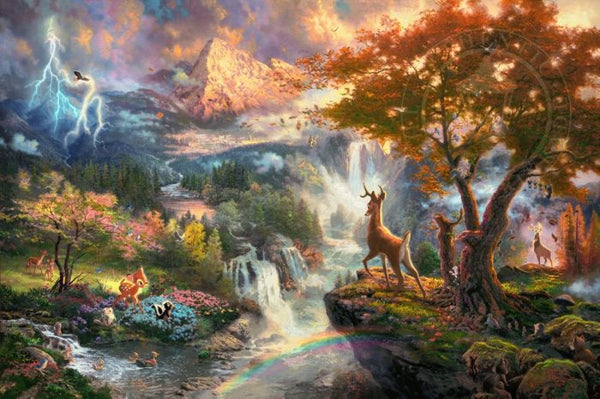 To suggest the moment of Bambi’s empowerment, I positioned him on a rocky precipice overlooking the terrain of his kingdom and the four seasons of his first year. If you look closely, Bambi’s self-sacrificing mother can be seen, as a half hidden image upon the distant mountain. Truly, a mother’s love, like the spirit of the mighty mountains, will guide a son forever. The central theme of Bambi is the cycle of the seasons and the ongoing flow of life. Truly, water flows through the world like life itself – a timeless reminder that despite the passing seasons, nature thrives and a new generation is born.
